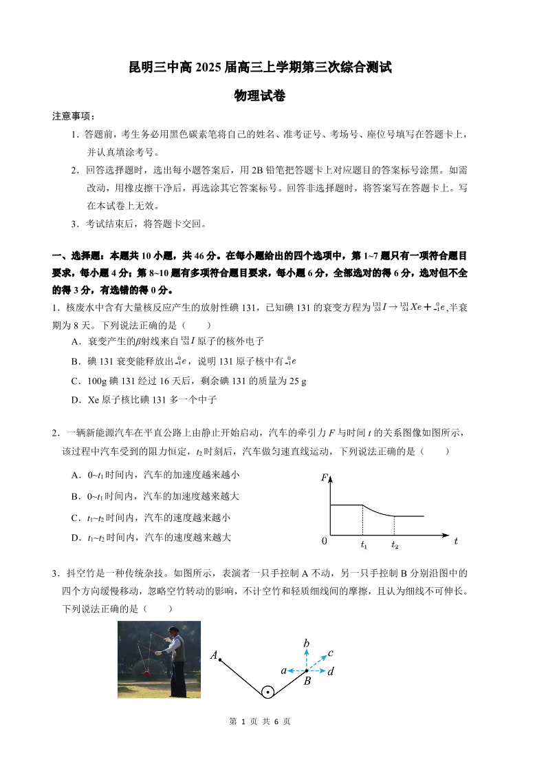 云南省昆明市第三中学2024-2025学年高三上学期11月月考物理