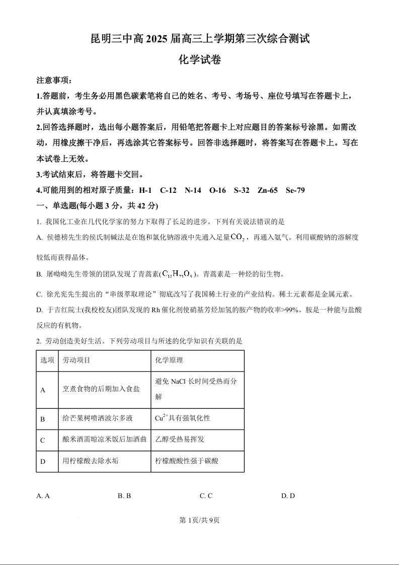 云南省昆明市第三中学2024-2025学年高三上学期11月月考化学(原卷版)