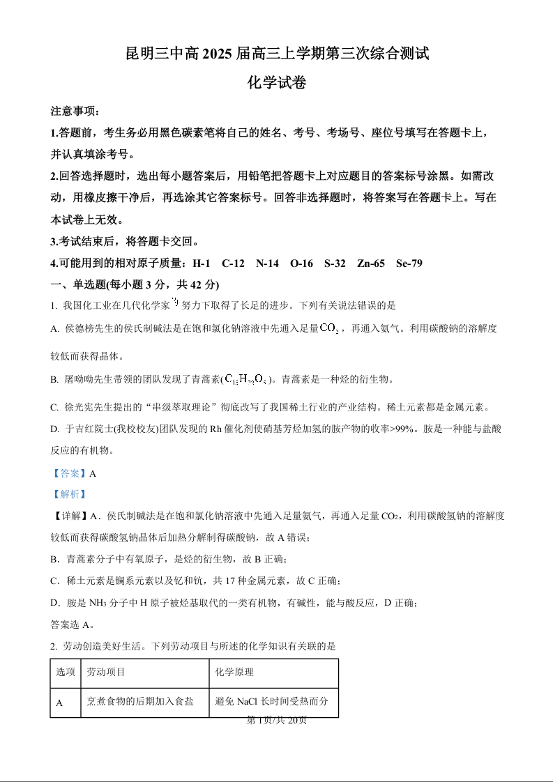 云南省昆明市第三中学2024-2025学年高三上学期11月月考化学(精品解析版)