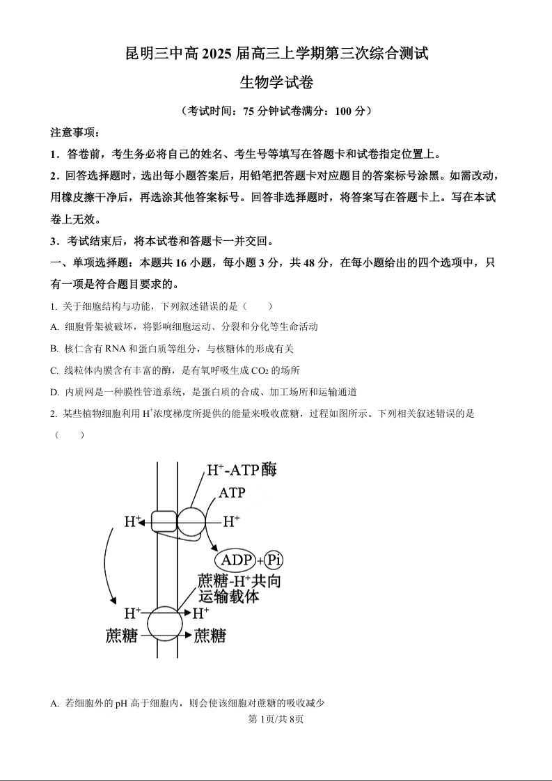 云南省昆明市第三中学2024-2025学年高三上学期11月月考生物(原卷版)