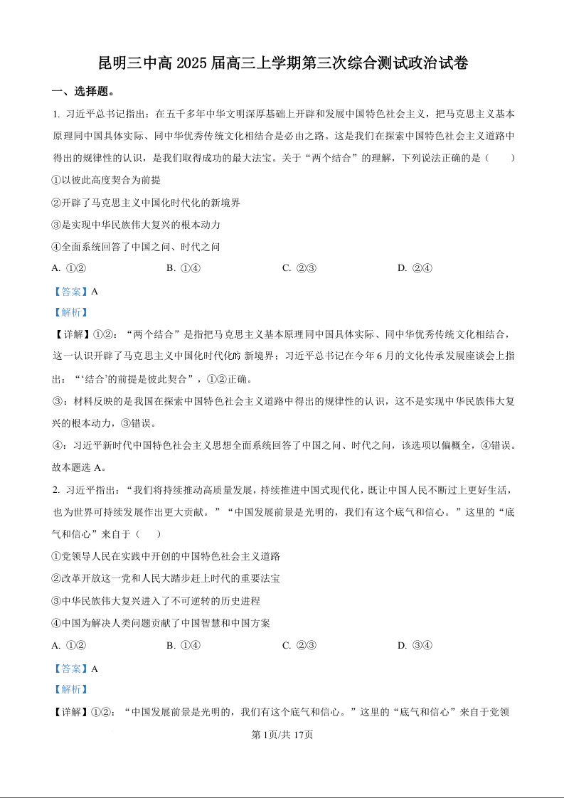 云南省昆明市第三中学2024-2025学年高三上学期11月月考政治答案