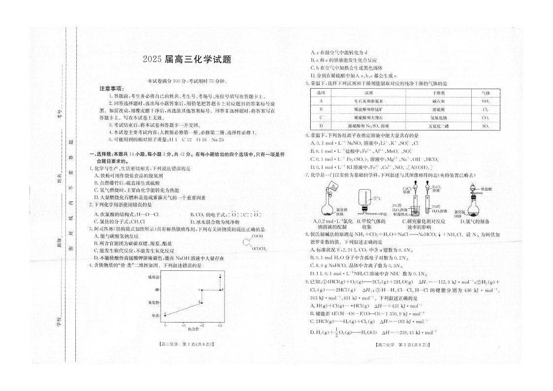 四川省部分学校2024-2025学年高三12月联考化学
