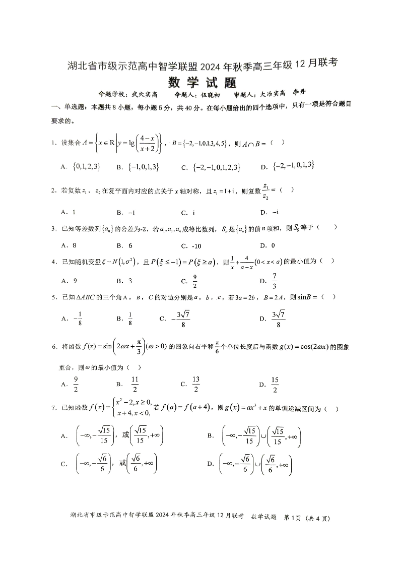 湖北省市级示范高中智学联盟 2025届高三12月联考数学