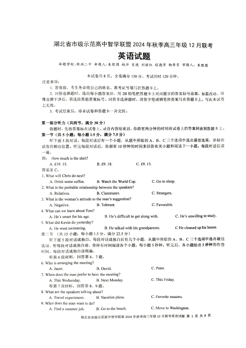 湖北省市级示范高中智学联盟 2025届高三12月联考英语