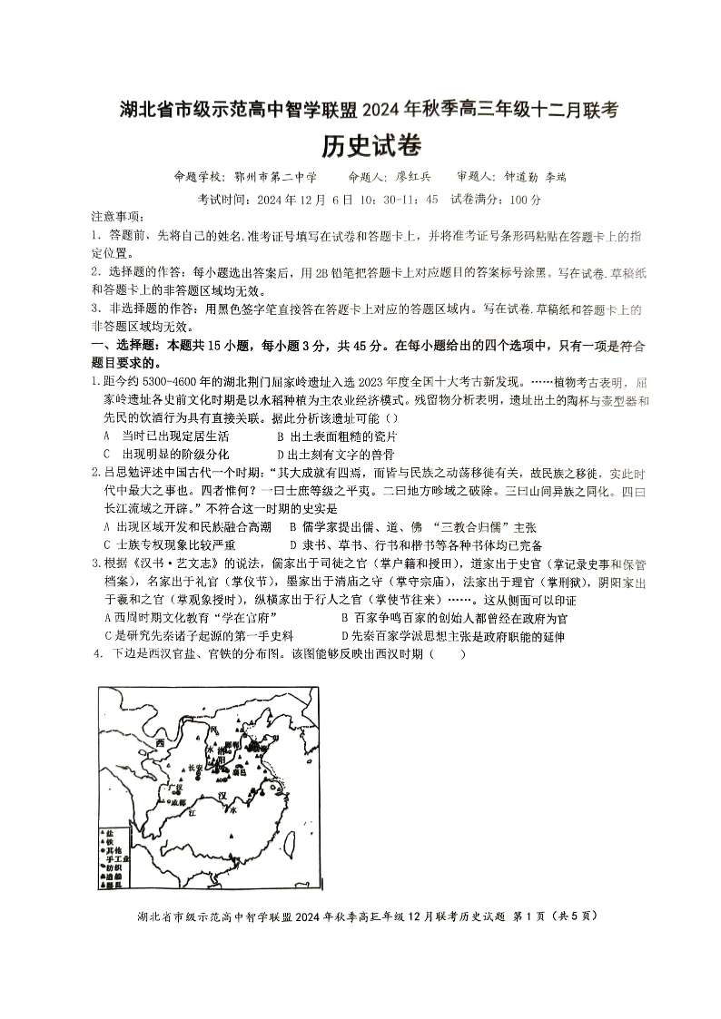 湖北省市级示范高中智学联盟 2025届高三12月联考历史