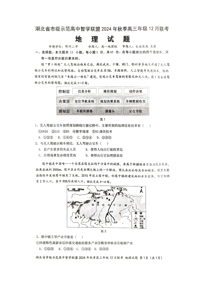 湖北省市级示范高中智学联盟 2025届高三12月联考地理