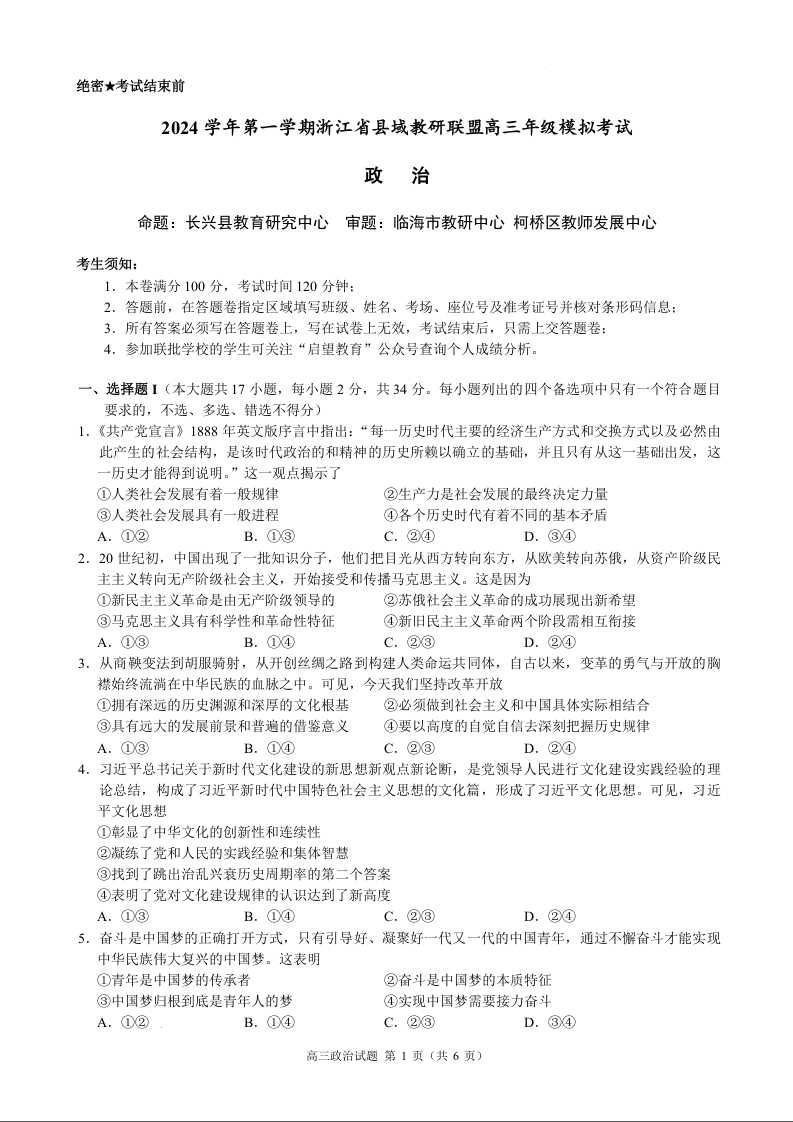 浙江省县域教研联盟2025届高三上学期12月学考模拟考政治