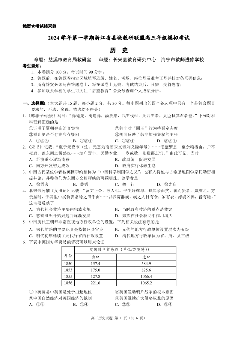 浙江省县域教研联盟2025届高三上学期12月学考模拟考历史