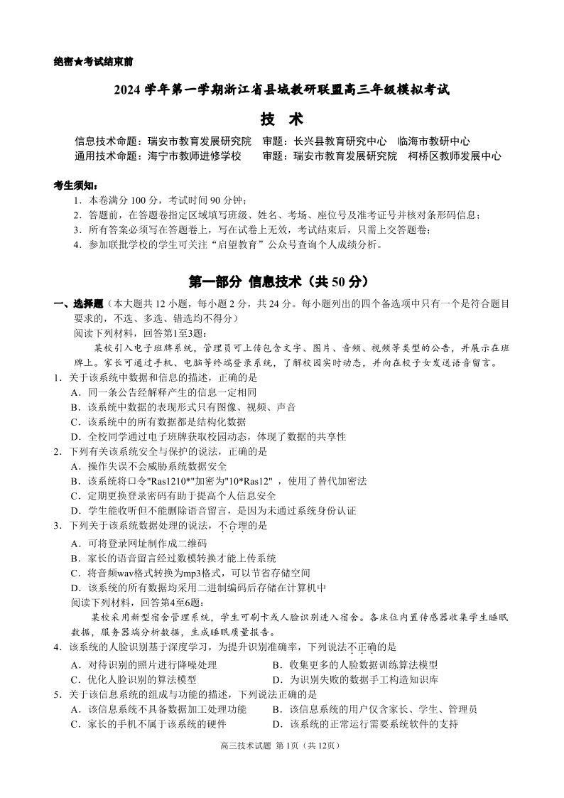 浙江省县域教研联盟2025届高三上学期12月学考模拟考技术