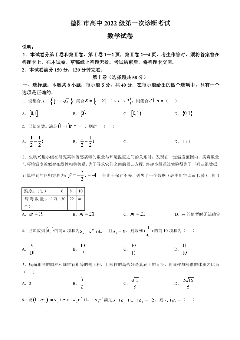 四川省德阳市高中2022级第一次诊断考试数学Word版含答案
