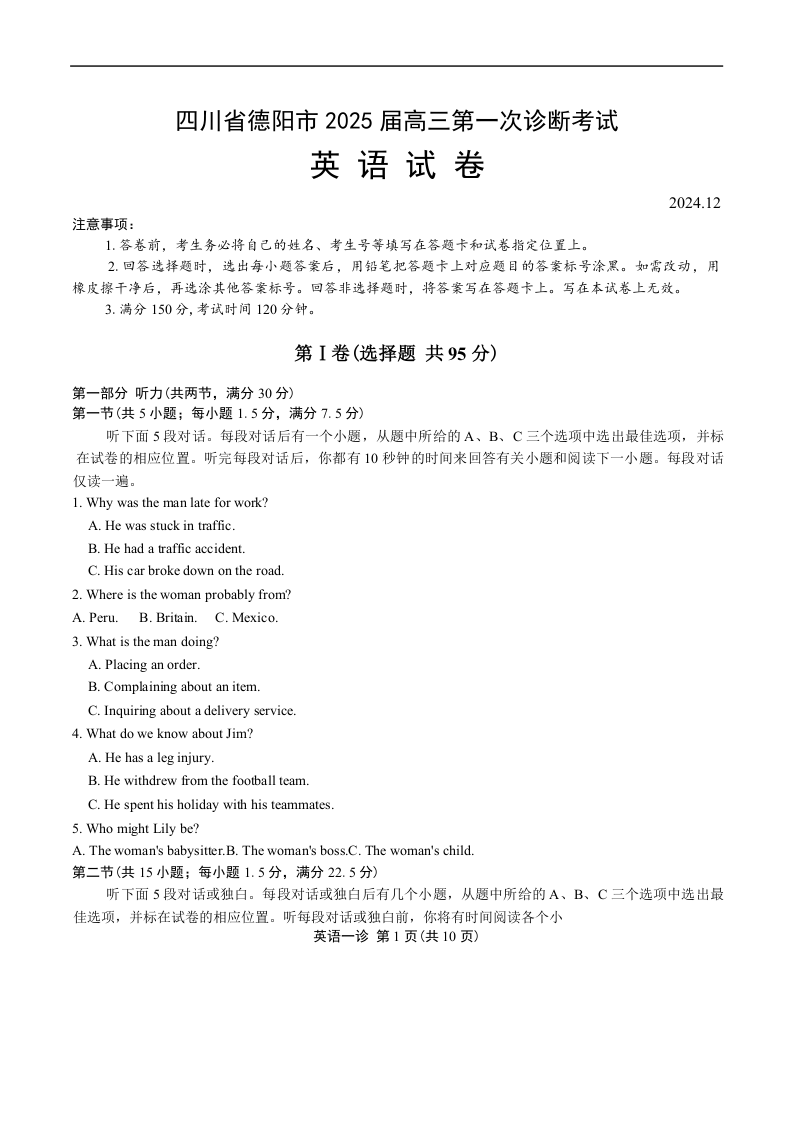 四川省德阳市高中2022级第一次诊断考试英语Word版含答案(及听力原文)
