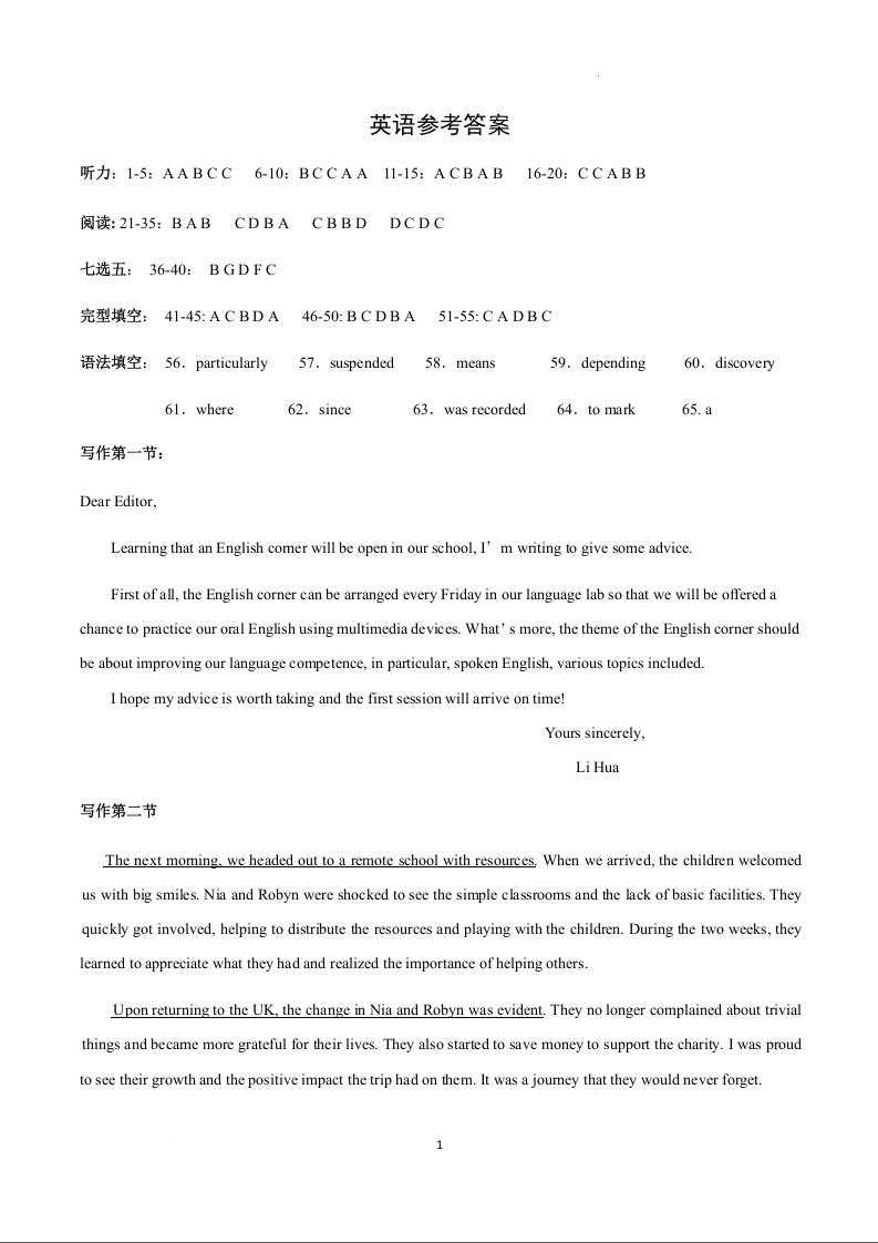 甘肃省兰州市第一中学2025届高三上学期11月月考英语答案