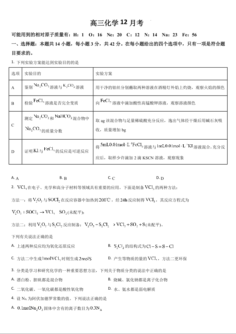 吉林省通化市区域高中2025届高三上学期12月月考化学Word版含答案