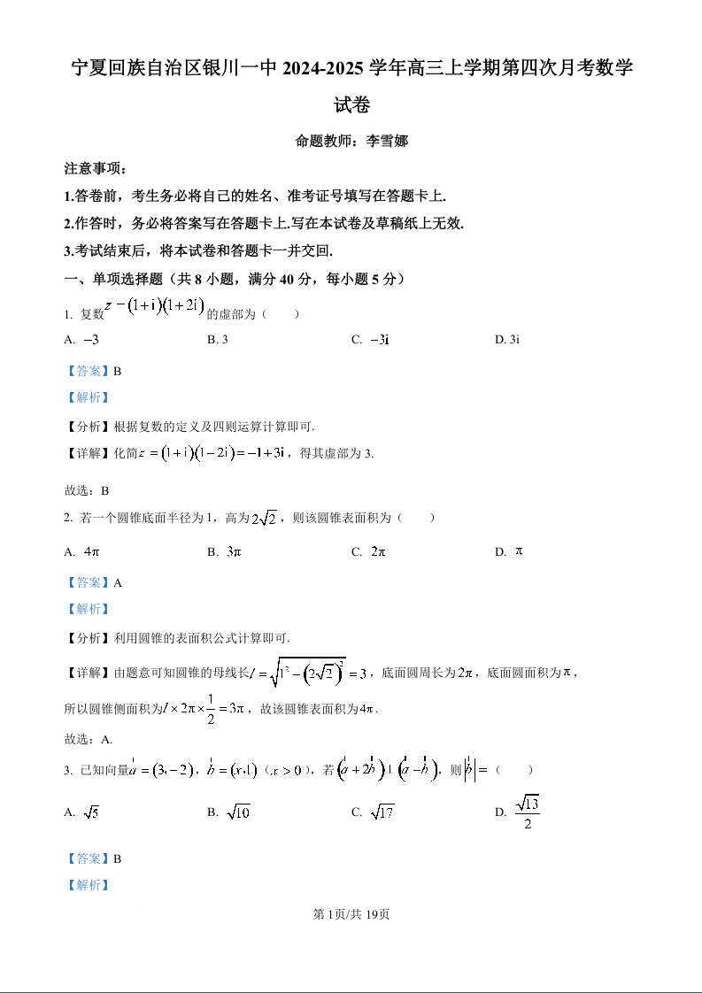 宁夏回族自治区银川一中2025届高三上学期第四次月考数学(精品解析版)
