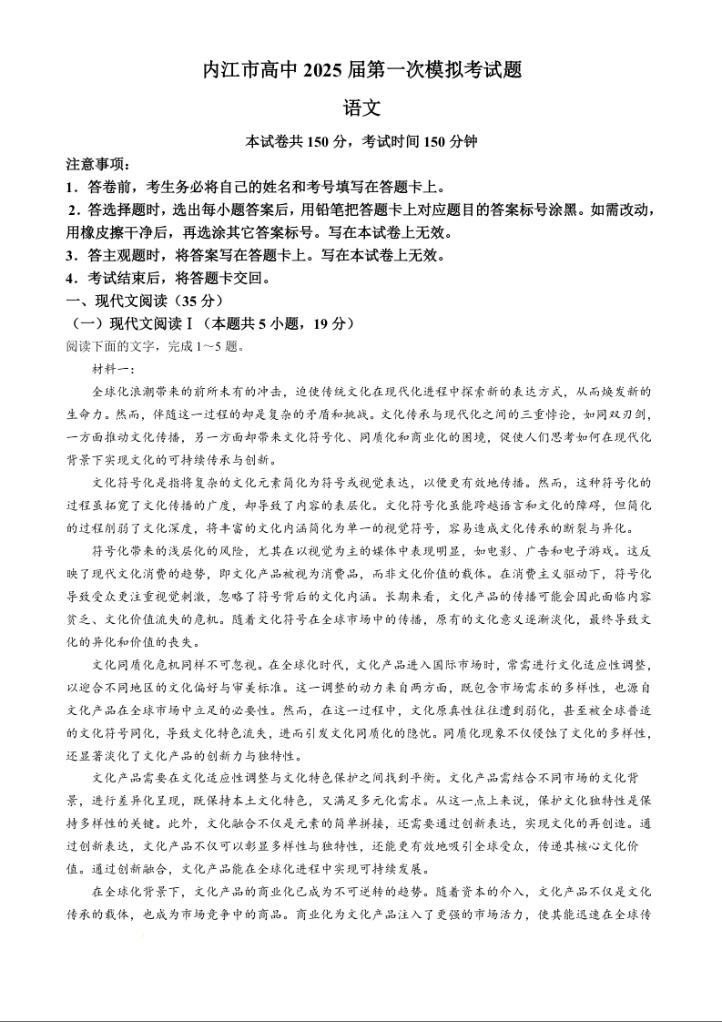 四川省内江市高中2025届第一次模拟考试语文Word版含答案