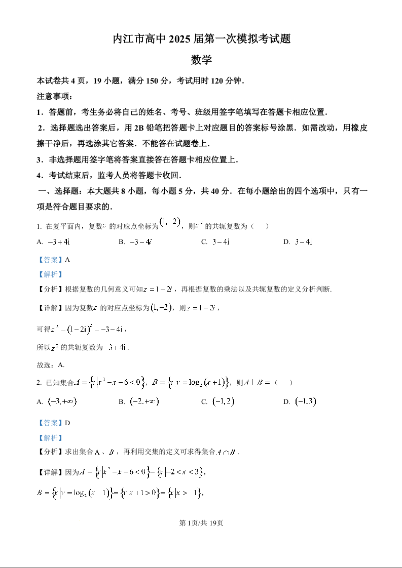 四川省内江市高中2025届第一次模拟考试数学(精品解析版)