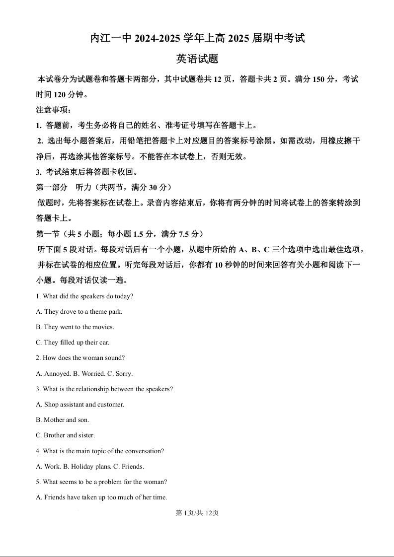 四川省内江一中2024-2025学年上高2025届期中考试英语(原卷版)
