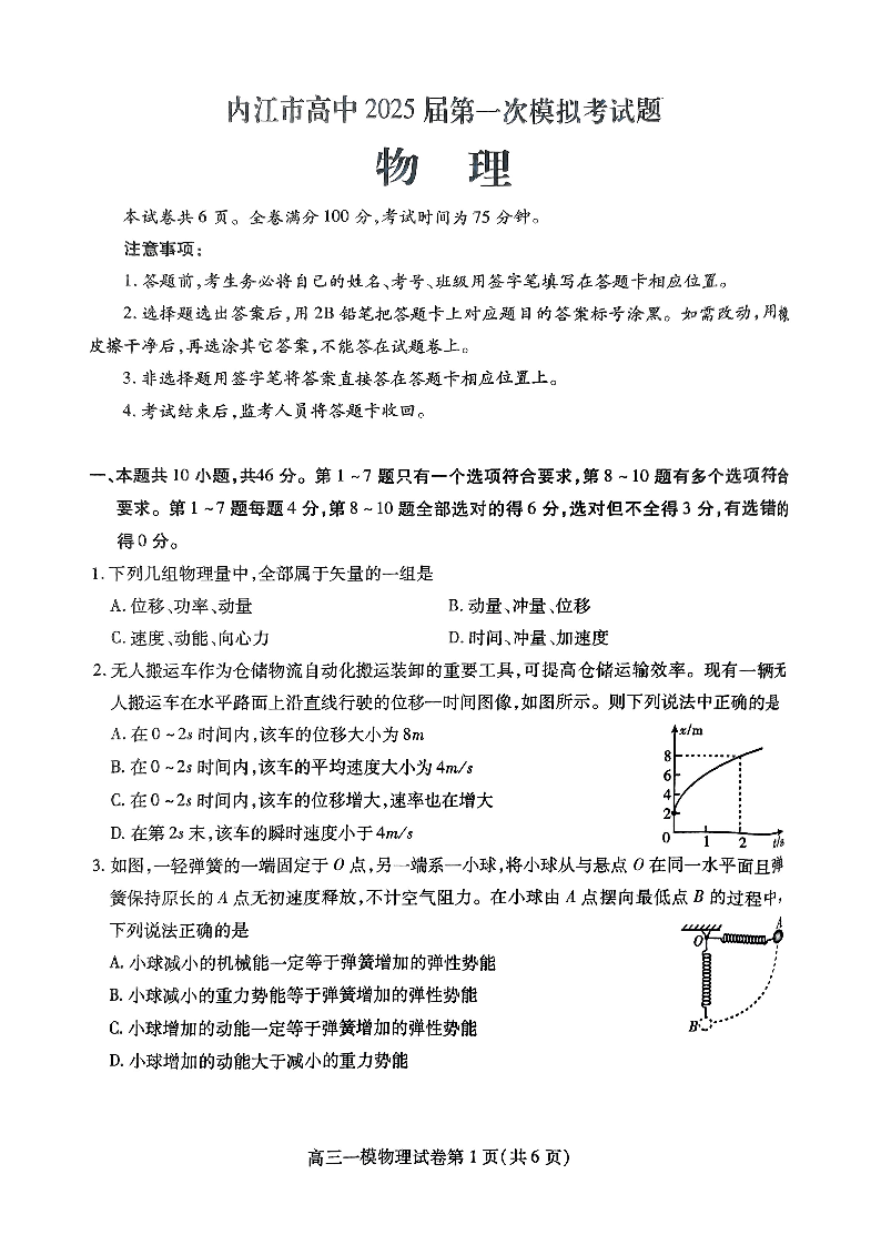 四川省内江市高中2025届第一次模拟考试物理PDF版含答案