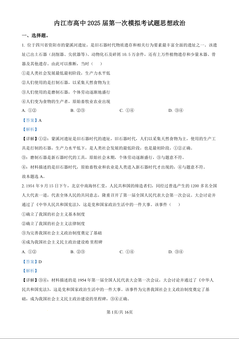 四川省内江市高中2025届第一次模拟考试政治(精品解析版)