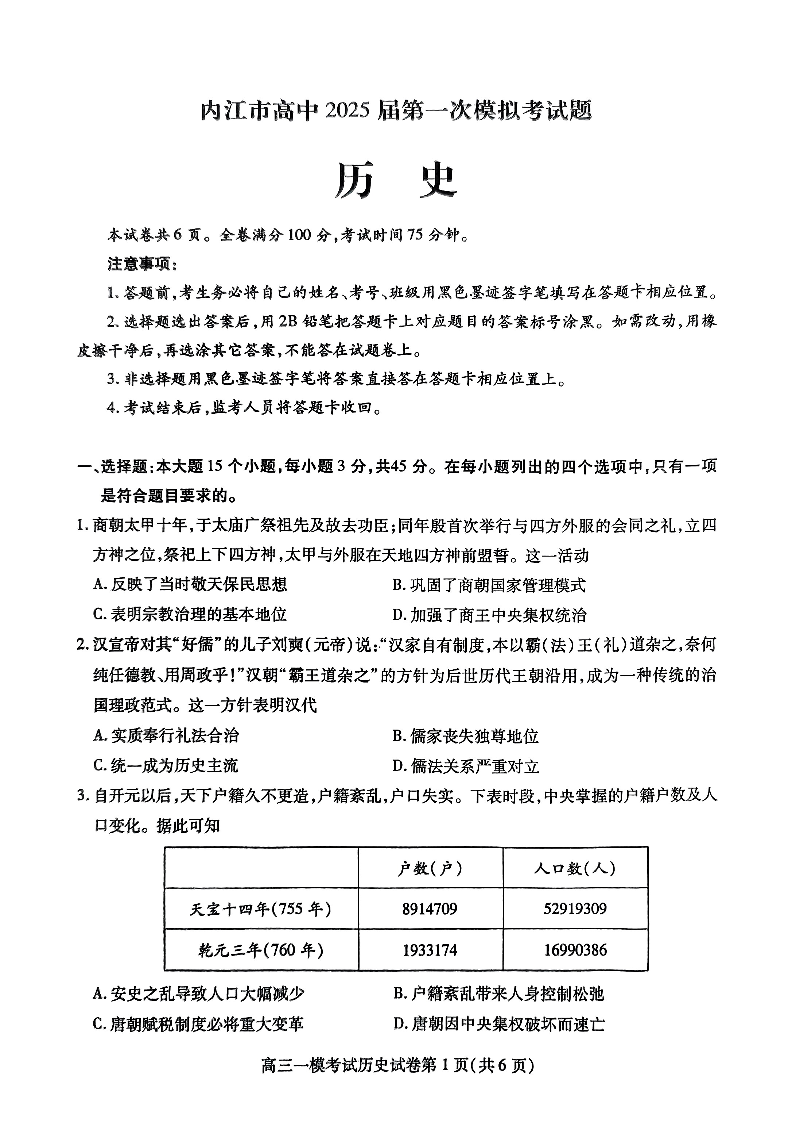 四川省内江市高中2025届第一次模拟考试历史PDF版含答案