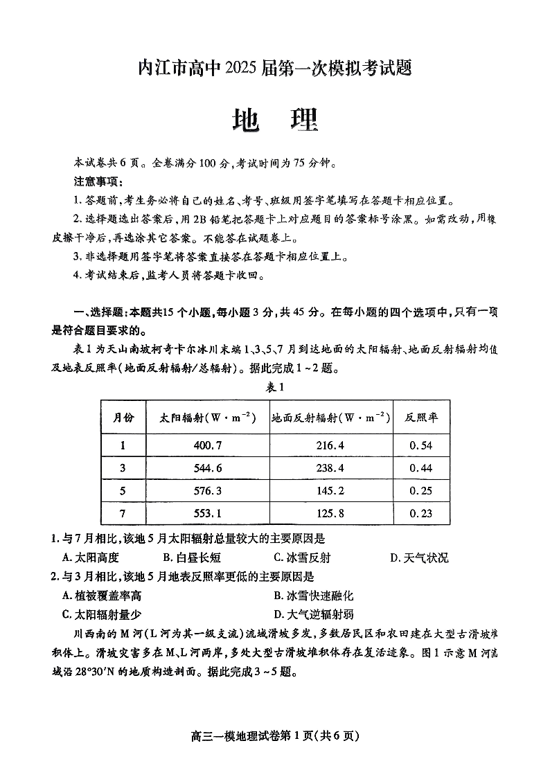 四川省内江市高中2025届第一次模拟考试地理PDF版含答案