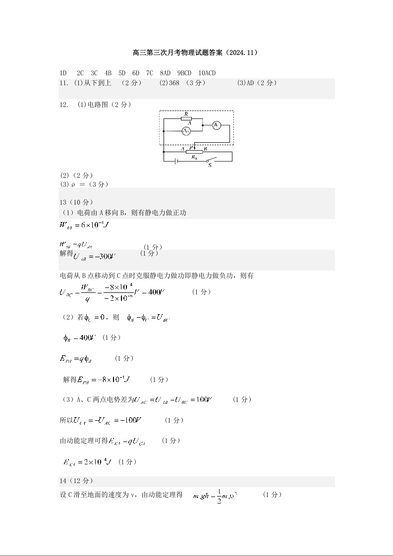 黑龙江省实验中学2024-2025学年度高三上学期第三次月考物理答案