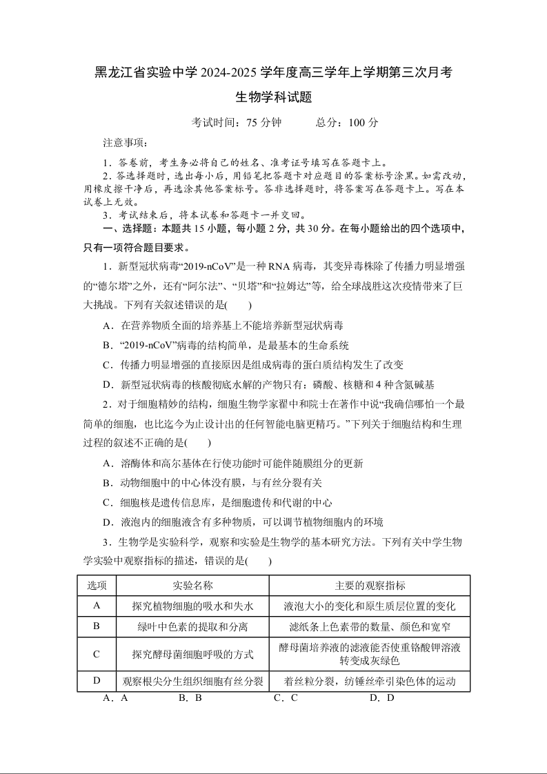 黑龙江省实验中学2024-2025学年度高三上学期第三次月考生物
