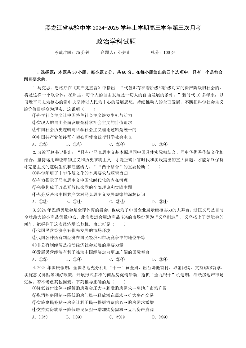 黑龙江省实验中学2024-2025学年度高三上学期第三次月考政治