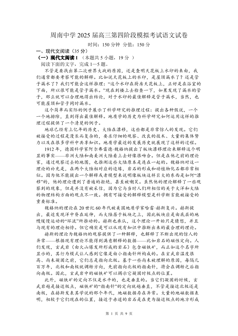湖南省长沙市周南中学2025届高三上学期第四阶段模拟考试语文