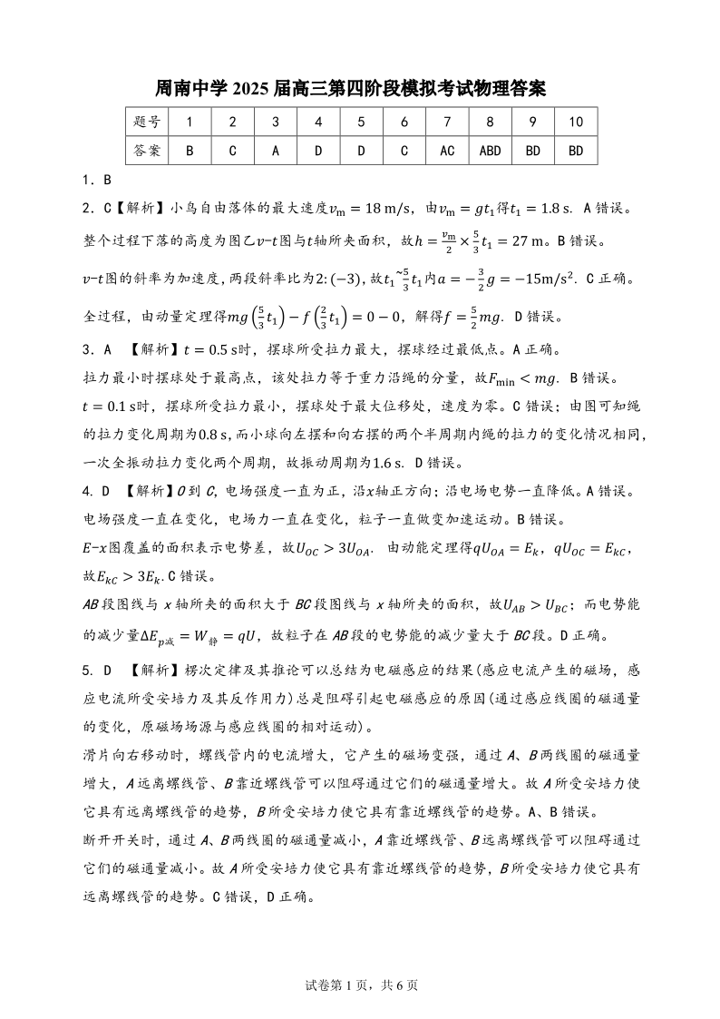 湖南省长沙市周南中学2025届高三上学期第四阶段模拟考试物理答案