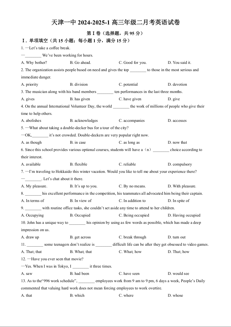 天津市第一中学2024-2025学年高三上学期第二次月考英语