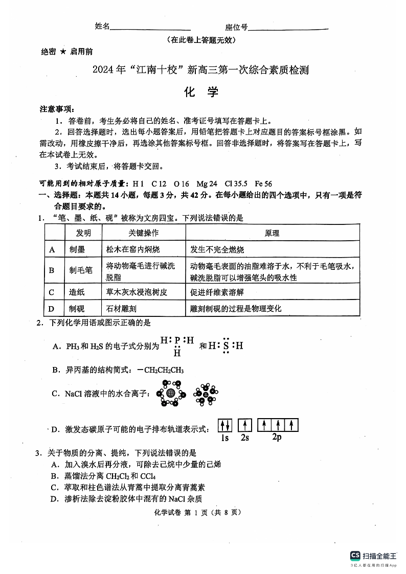 安徽省江南十校2025届新高三第一次综合素质检测化学
