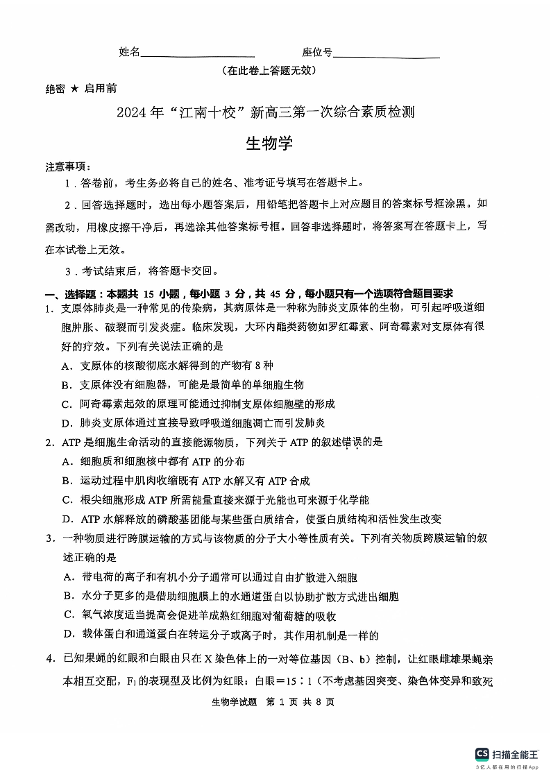 安徽省江南十校2025届新高三第一次综合素质检测生物