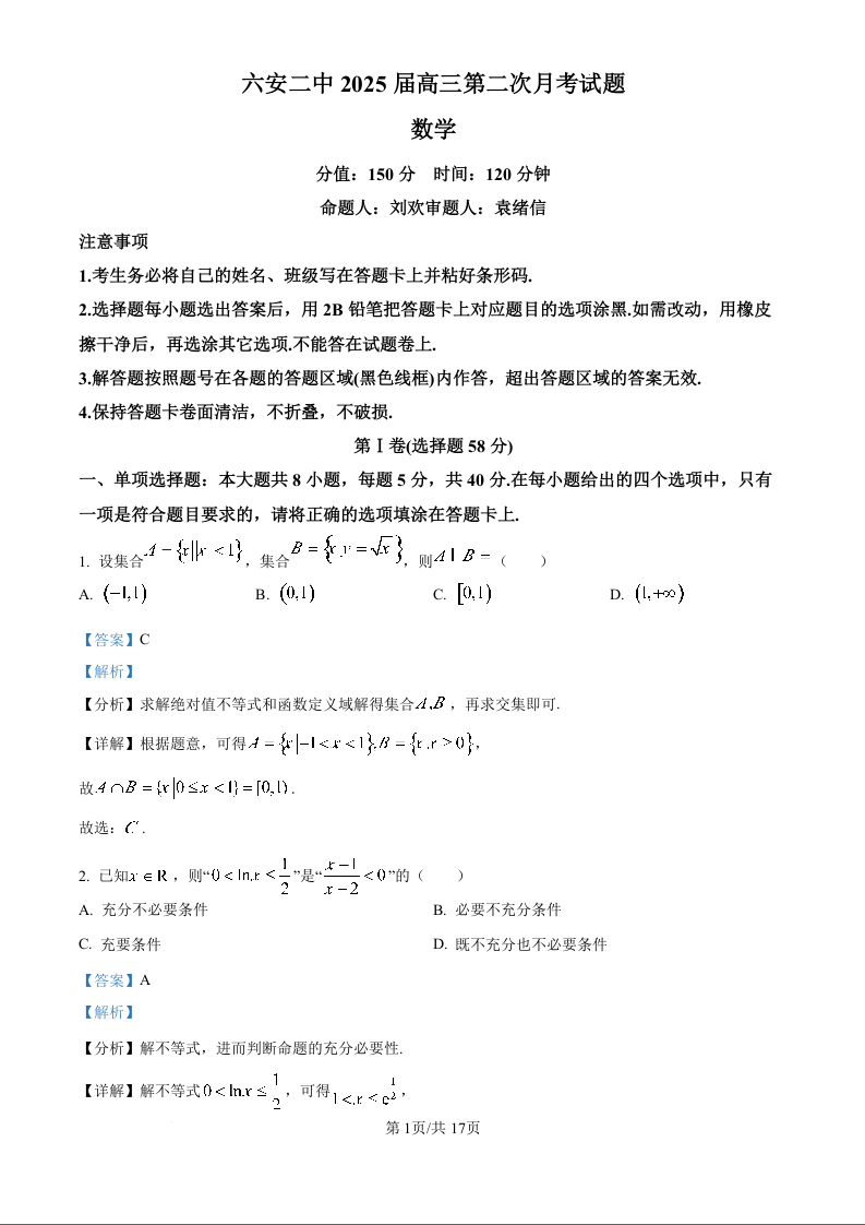 安徽省六安市第二中学2024-2025学年高三上学期10月月考数学答案