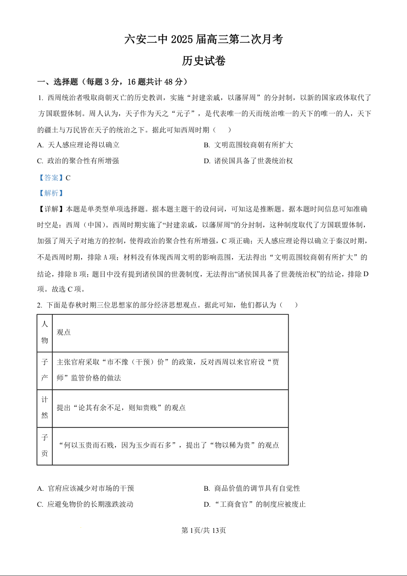 安徽省六安市第二中学2024-2025学年高三上学期10月月考历史答案