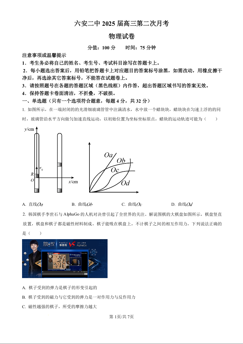 安徽省六安市第二中学2024-2025学年高三上学期10月月考物理