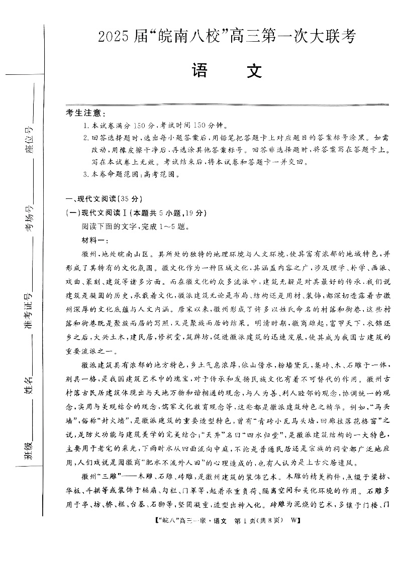 安徽省皖南八校2025届高三第一次大联考语文试卷