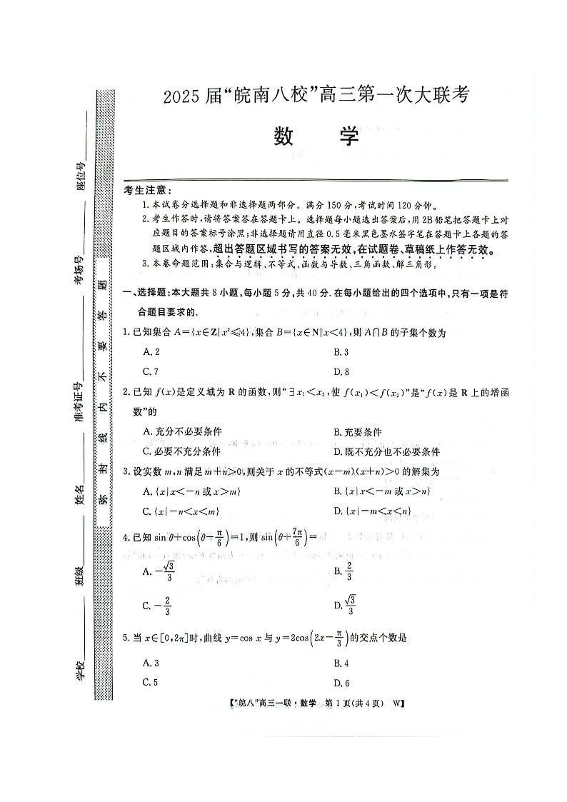 安徽省皖南八校2025届高三第一次大联考数学+答案