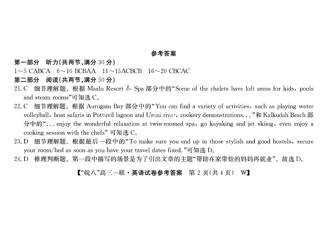 安徽省皖南八校2025届高三第一次大联考英语答案
