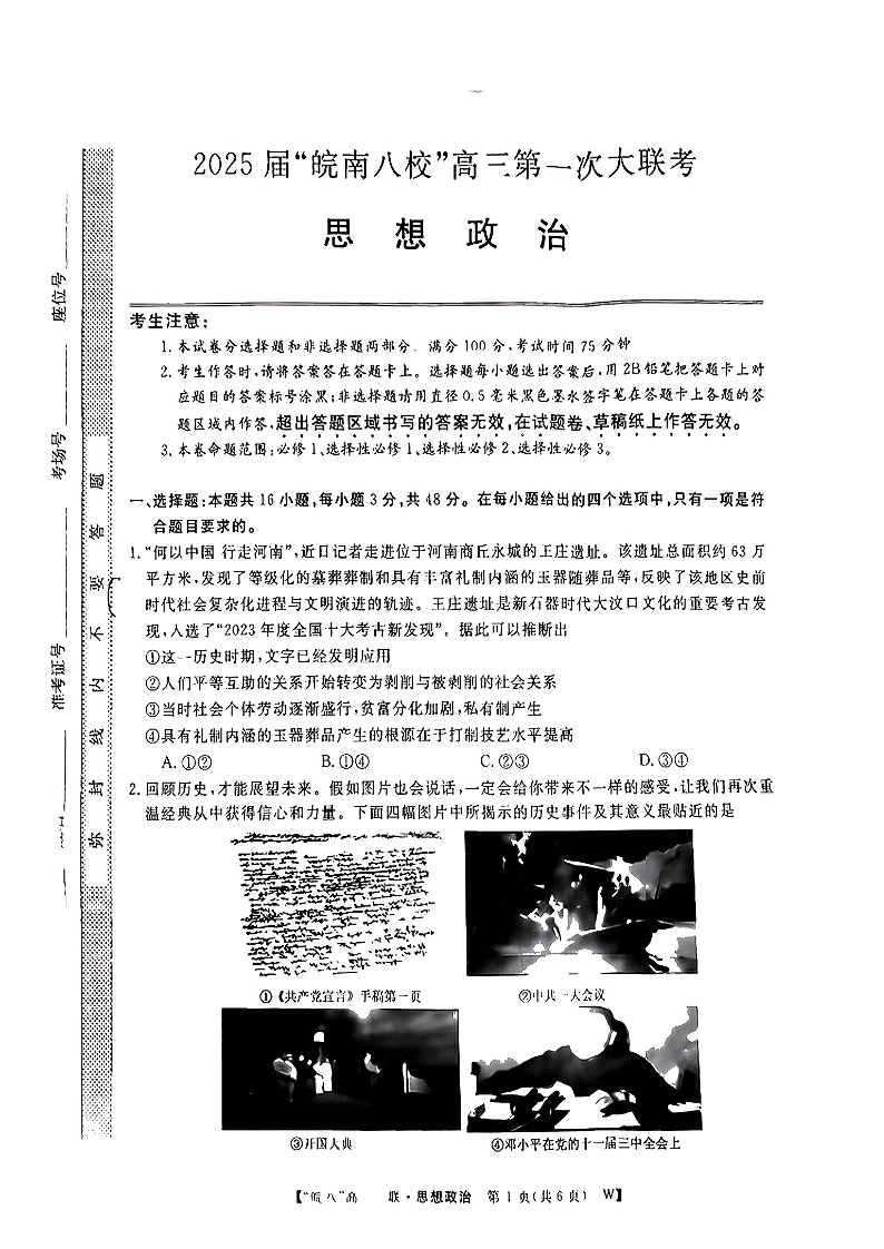 安徽省皖南八校2025届高三第一次大联考政治+答案