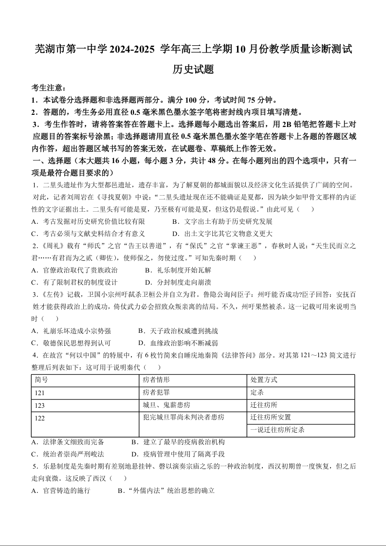 安徽省芜湖市第一中学2025届高三上学期10月份教学质量诊断测试历史+答案