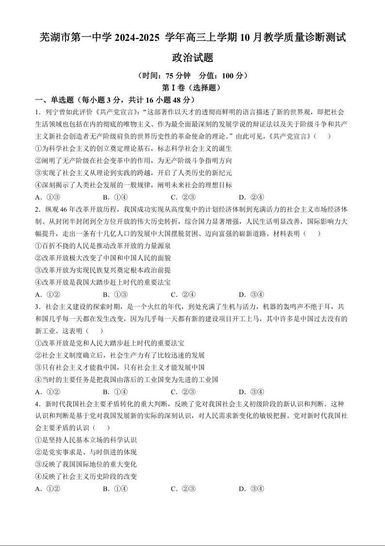 安徽省芜湖市第一中学2025届高三上学期10月份教学质量诊断测试政治+答案
