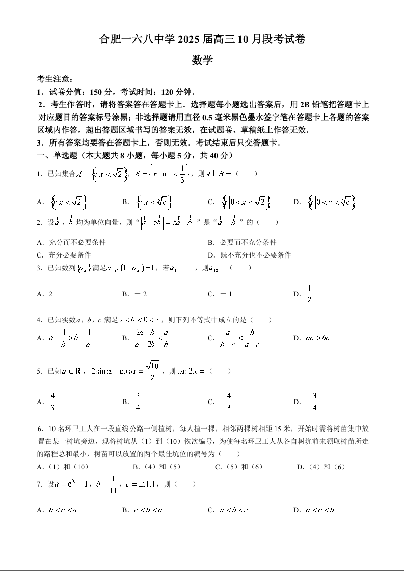 安徽省合肥一六八中学2025届高三上学期10月段考数学+答案