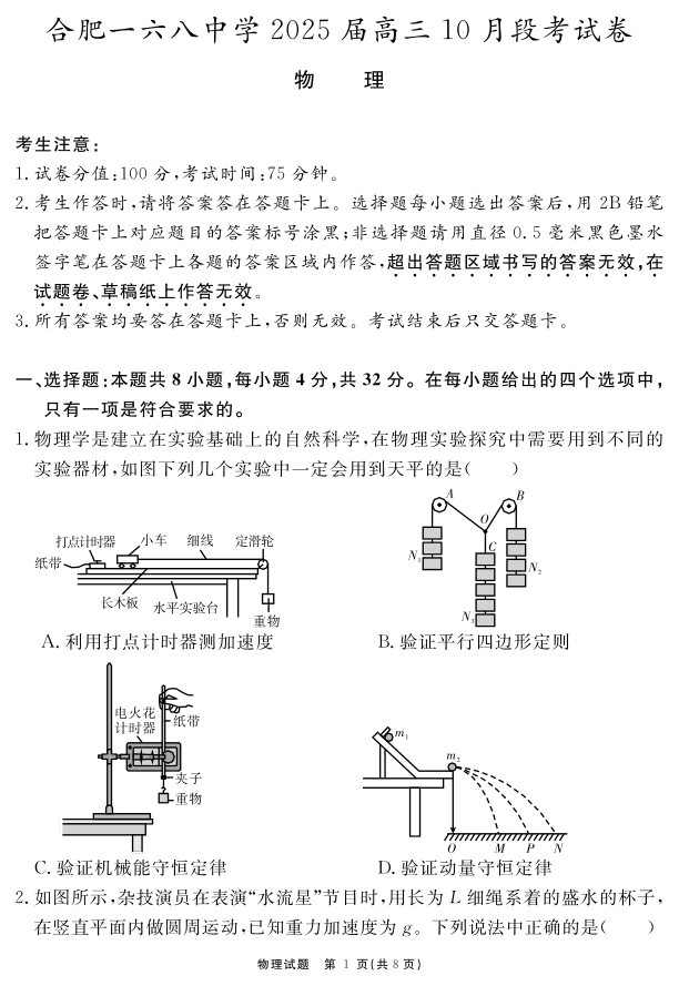 安徽省合肥一六八中学2025届高三上学期10月段考物理+答案