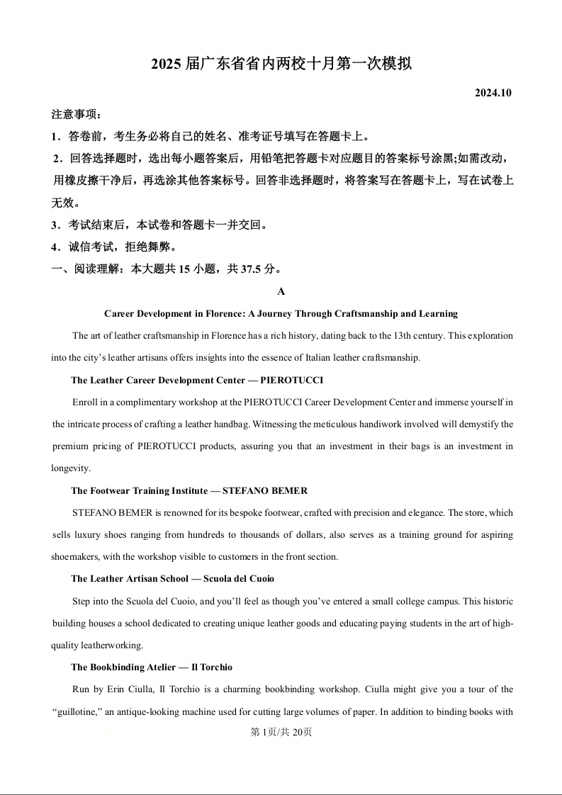 2025届广东省联考高三上学期10月第一次模拟(一模)英语试题答案
