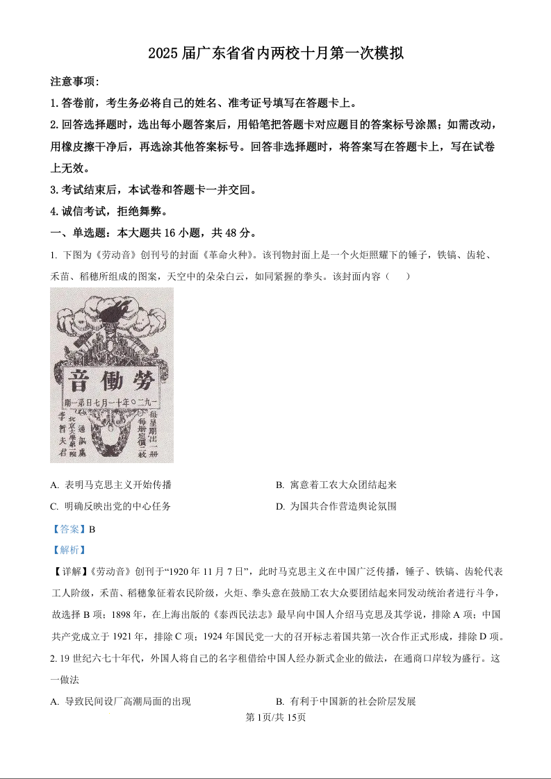 2025届广东省联考高三上学期10月第一次模拟(一模)历史试题答案