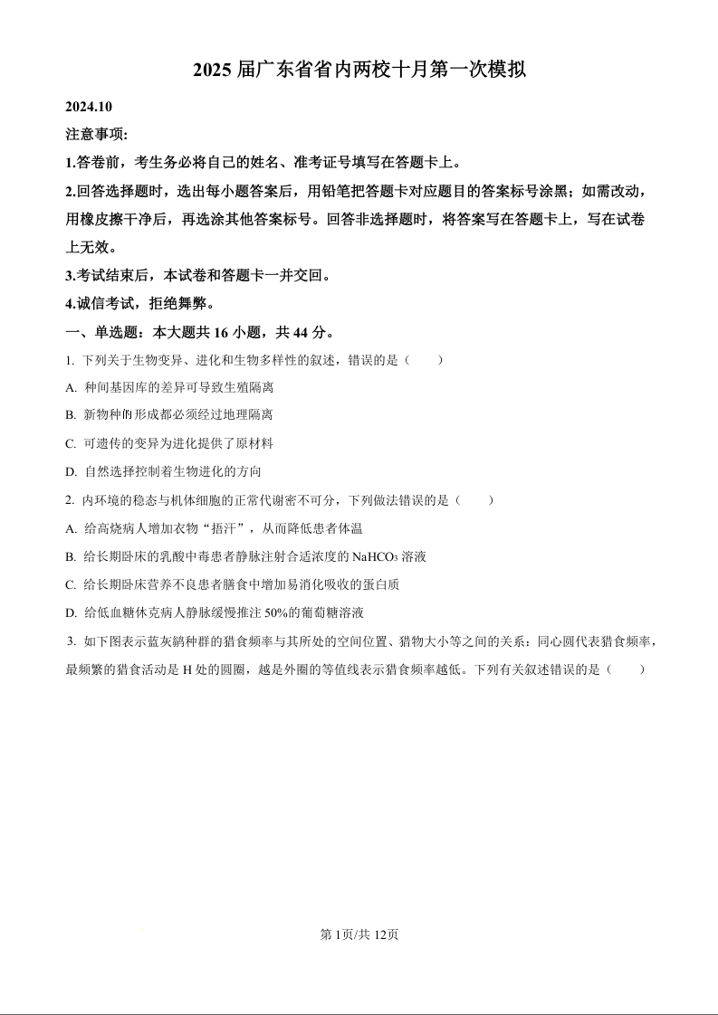2025届广东省联考高三上学期10月第一次模拟(一模)生物试题