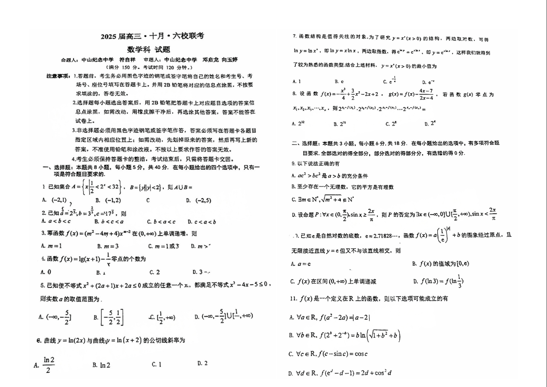 广东省2025届高三10月六校联考数学试题+答案