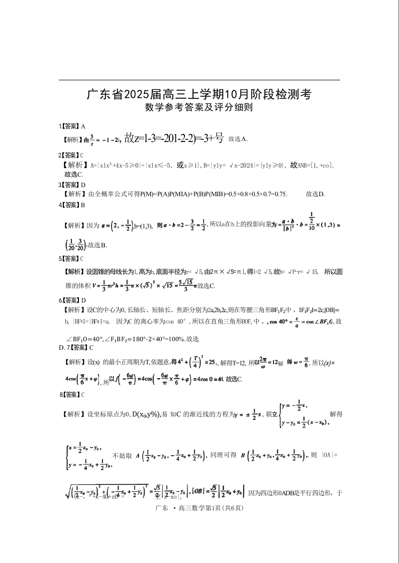 广东省2025届高三上学期10月阶段检测考数学试题答案