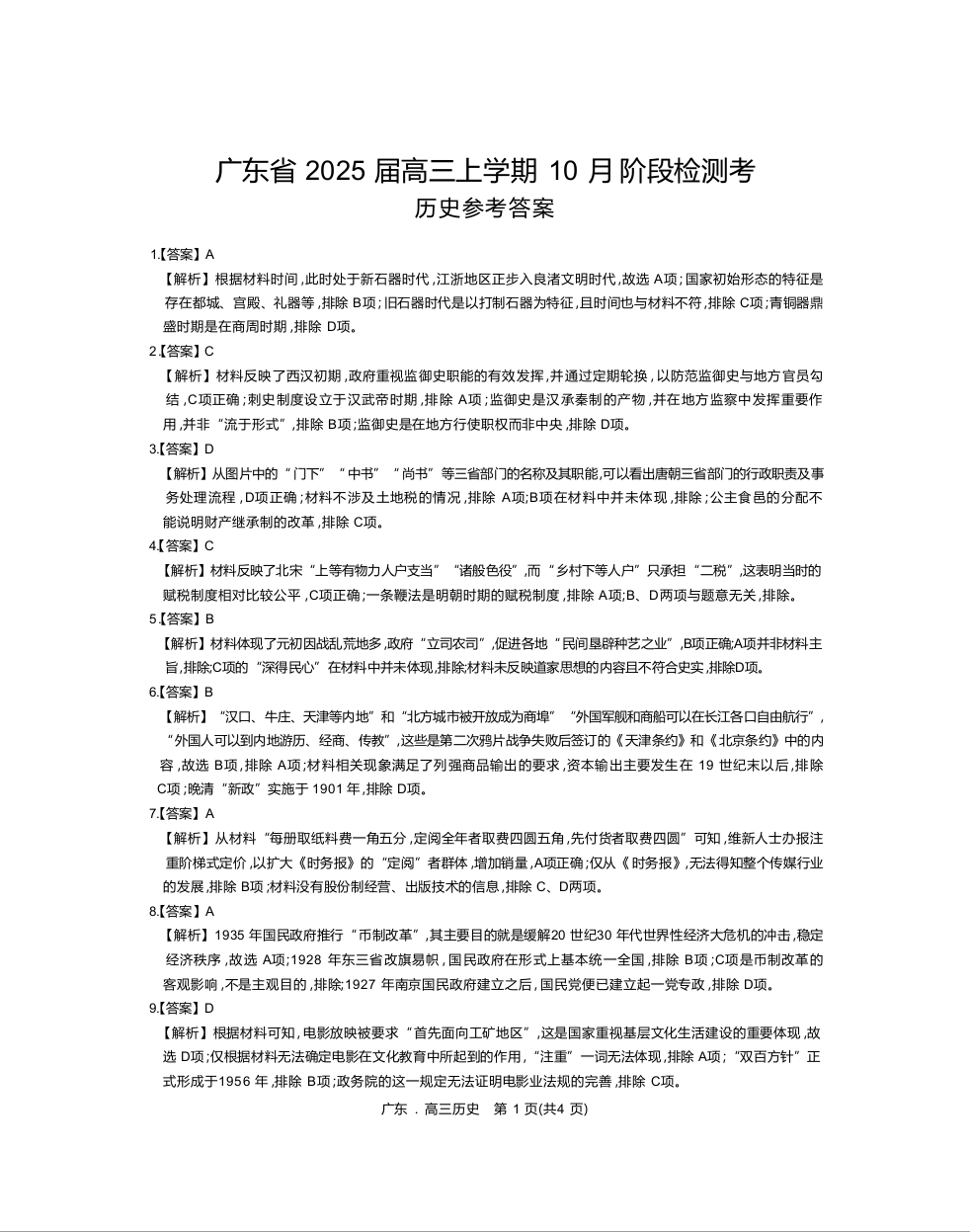 广东省2025届高三上学期10月阶段检测考历史答案